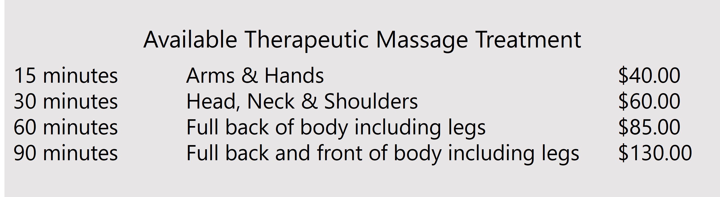 Therapeutic massage therapy focuses on area of concern to help restore normal functional use of muscles. The purpose is to achieve a structural change and therapeutic benefit in the body. The massage mobilizes soft tissues to restore normal functional use.